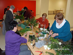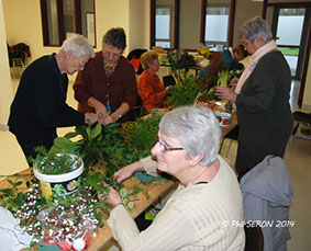 En seulement deux heures, on coupe, on taille, on ligature, on pique dans la mousse et l'on décore dans une ambiance studieuse et amicale. Chacune penchée sur son travail sous l’œil expert de Janine Hoinant.