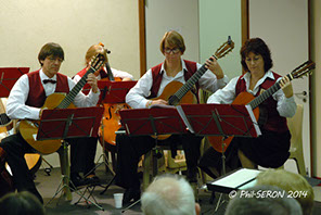 Le programme était tel que tour à tour tous les pupitres ont été mis à l’honneur que ce soit dans la SONATA pour deux mandolines (Janine HOINANT et Michel RIBINSLI) et violoncelle (Agnès BELIN), dans le VIENTO DE OTONO, trio dans lequel les guitaristes (Brigitte JOVET-VANGILVE- Marie-Noëlle MOURTOUX et Philippe VANNIER) ont fait étalage de tout leur talent, dans un classique de la musique tzigane « LES YEUX NOIRS » avec à nouveau Michel RYBINSJKI dans le rôle du soliste ou dans cet étonnant CONCERTO EXOTIQUE de Mario MACIOCVHI avec Brigitte JOVET-VANGILVE, à la flûte qui nous donnait l’impression d’avoir franchi…la Méditerranée.